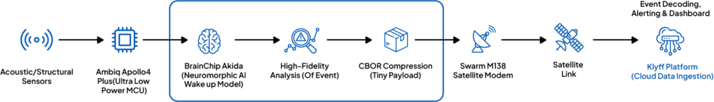The “Hard Tech” Solution: Klyff deployed a “Decision-Triggered” Edge Pipeline. The device runs a low-power “Wake-up” model locally. Only when a potential structural anomaly is detected does the high-fidelity model activate, compress the specific “event” data, and send a tiny (5KB) summary report via satellite.