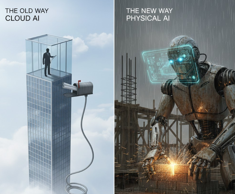 Think of traditional cloud AI as a brilliant architect who works in a distant office, sending blueprints (data) back and forth via mail. It is slow and detached from the construction site. Physical AI at the edge is like putting that architect directly on the building site, giving them hands, and teaching them to lay bricks. They can see problems immediately, adapt to the weather instantly, and get the job done without waiting for instructions from headquarters.