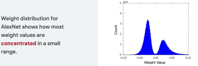 Neural network weights tend to be normally distributed and clustered within specific critical ranges. For example, in AlexNet, the weights form a narrow distribution, often appearing as “two ginormous lumps” in a histogram.