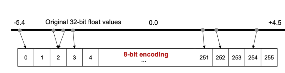 - Mapping: The algorithm stores the min and max for each layer. It then compresses each float value to the closest 8-bit integer in a linear set.