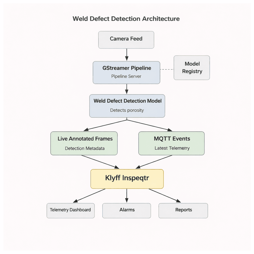In this blog, we build a real-time Weld Porosity Detection Edge AI system that runs entirely at the edge. This enables detection during the welding process itself. Klyff Inspeqtr detects porosity and generates instant alerts. It enables immediate corrective action.