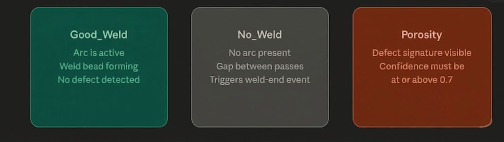 The Model watches the ongoing welding area in real time and outputs exactly one of three labels per frame. These three states are the entire vocabulary that the detection system works with; every decision is built on this simple signal.