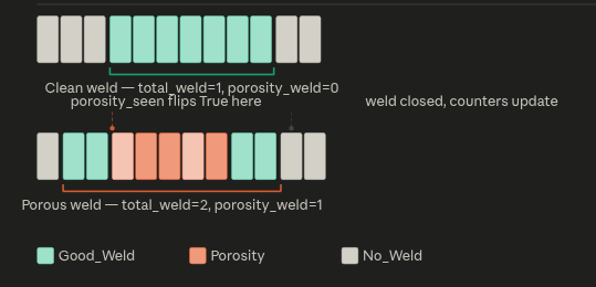 When a No_Weld frame arrives, the cycle ends. At this point, one weld is counted: total_weld += 1, and if porosity was seen, porosity_weld += 1. A single porosity_event = 1 signal is then sent for alerting.