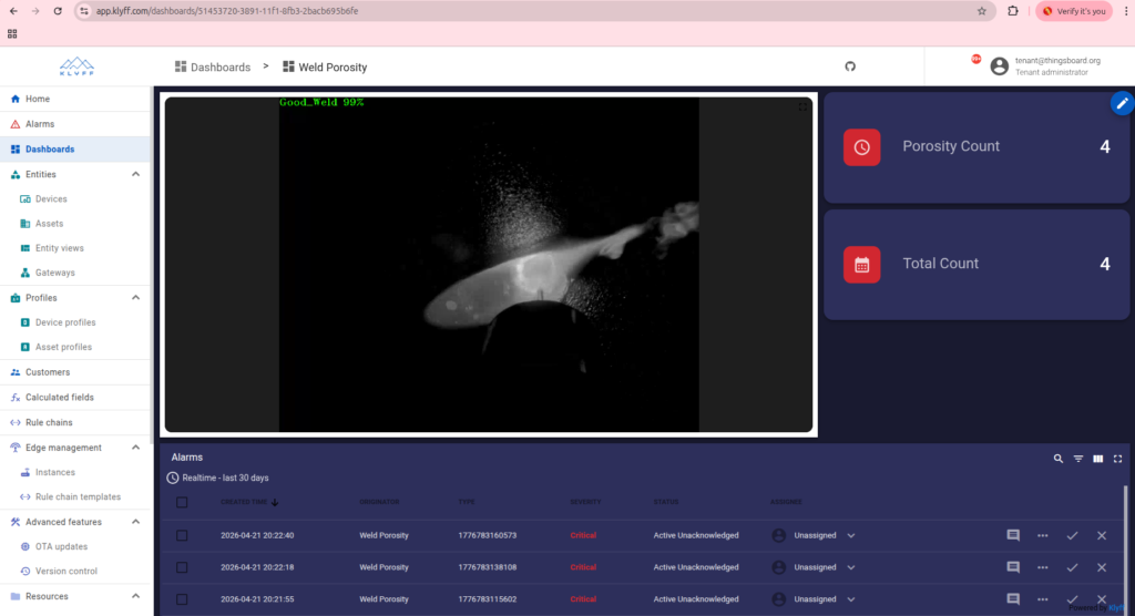 AI predictions are only effective when real systems can act on them. The system uses MQTT to send detection results from the weld porosity detection setup to IoT platforms like Klyff Inspeqtr. These platforms transform raw model outputs into clear, structured events that users can monitor and use for decision-making.