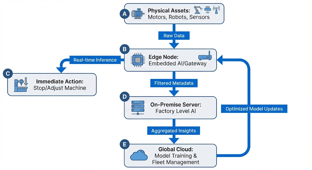 This flow is a perfect example of Edge AI because the Inference and the Actuator command happen locally. If the system had to send that image to a far-away cloud server to ask, “Is this product okay?”, the product would have already moved 10 feet down the belt before the answer came back. By keeping the “brain” next to the “eyes” (the camera), the factory can make split-second rejections.