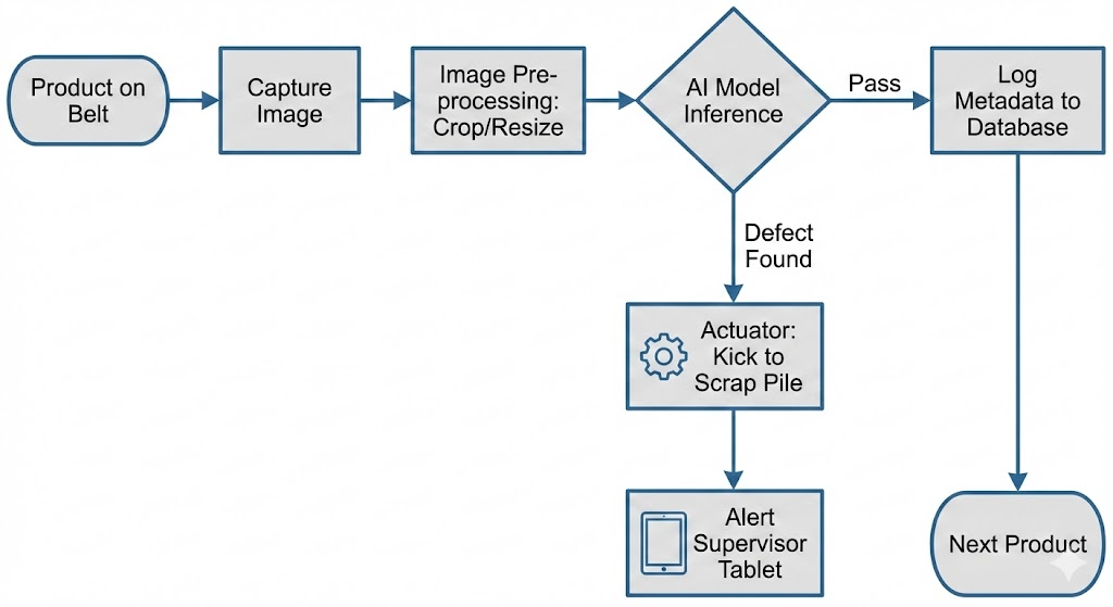 - AI Model Inference: This is the core of Edge AI. A pre-trained machine learning model analyzes the image to look for specific patterns—such as scratches, missing components, or incorrect dimensions.