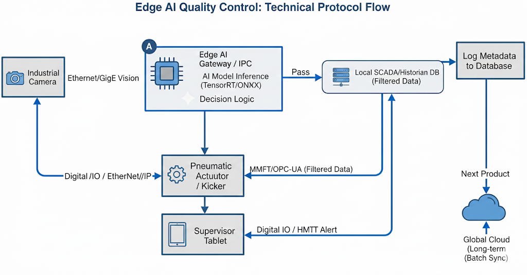 The raw data is sent immediately to an Edge Node (an Industrial PC or AI Gateway). This is the most critical stage for operational speed.