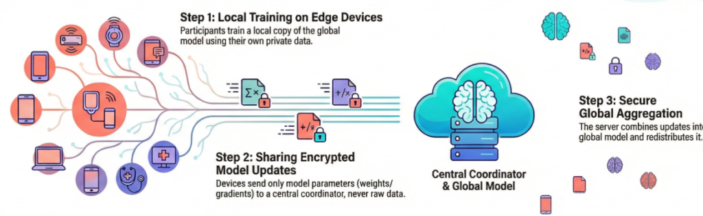 Federated Learning addresses these challenges by flipping the traditional paradigm. Instead of bringing the data to the model, FL brings the model to the data. It is a decentralised approach where the training process occurs locally on edge devices or on-premise servers. Only the mathematical updates (model weights or gradients)—which contain no raw data—are shared with a central coordinator.