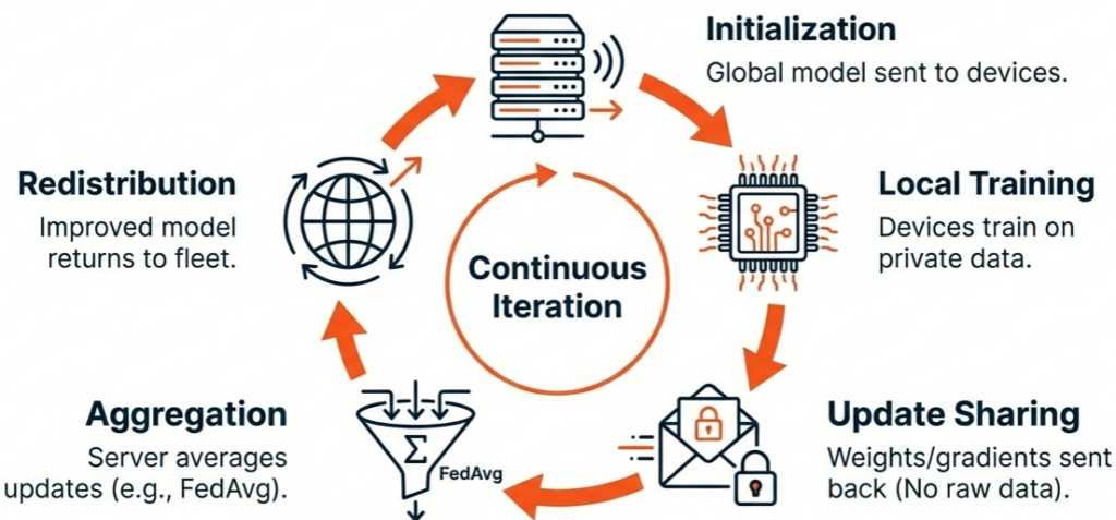 - Redistribution: The improved global model is now redistributed to all clients, and the cycle begins again