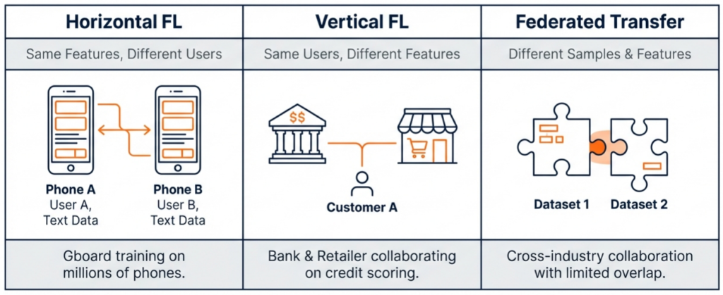 - Vertical Federated Learning (VFL): This applies when participants share the same sample space (same products/users) but have different data features.