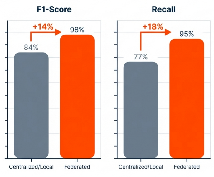 - Performance: The collaboration led to a model F1-Score of 98% (up from 84% on the local model) and a Recall improvement from 77% to 95%.