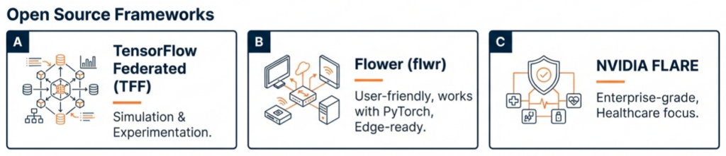 Several frameworks have emerged to facilitate FL deployment, ranging from open-source research tools to enterprise-grade platforms: