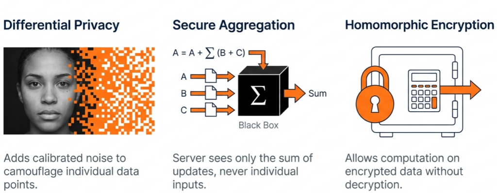 - Differential Privacy (DP): Adding calculated “noise” to the model updates before they are shared. This ensures that the contribution of any single data point cannot be distinguished, preventing reverse-engineering.
