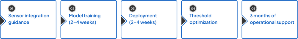 During production, real-time deviations from this learned baseline are flagged as anomalies—enabling early warnings even when labelled failure data is scarce or when failure modes are novel.Â